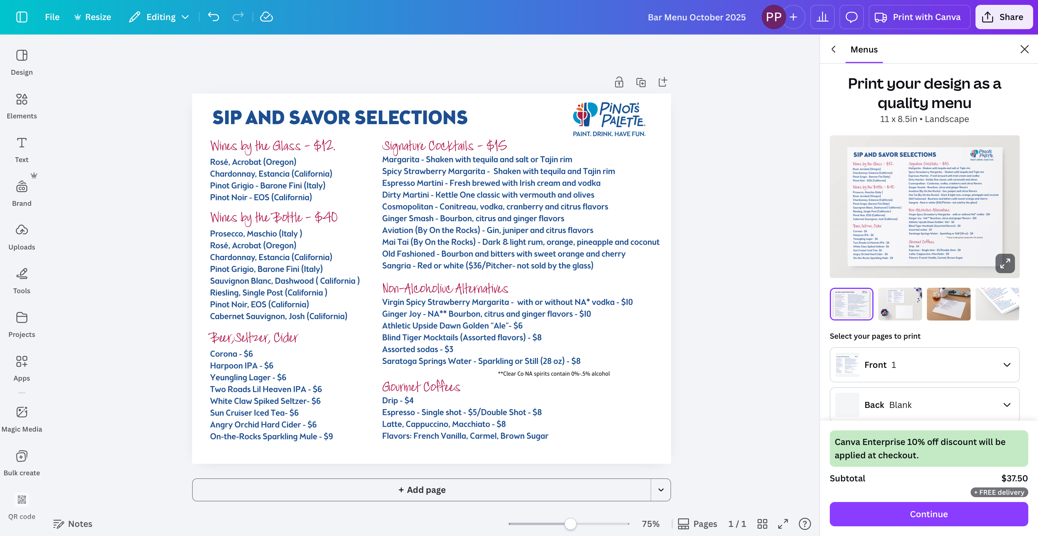 Pinot's Palette Stamford boasts a full-service bar with a wide range of top-shelf liquors, specialty cocktails, beer, and wine by the glass or bottle. Our extensive non-alcoholic offerings include craft mocktails and sodas, Athletic NA Beer and CleanCo nonalcoholic spirits. You can also enjoy fresh iced or hot drip or espresso drinks from the gourmet coffee bar which features sustainably sourced organic beans. We carry bagged snacks and sweets, including Sweet P Bakery cookies.